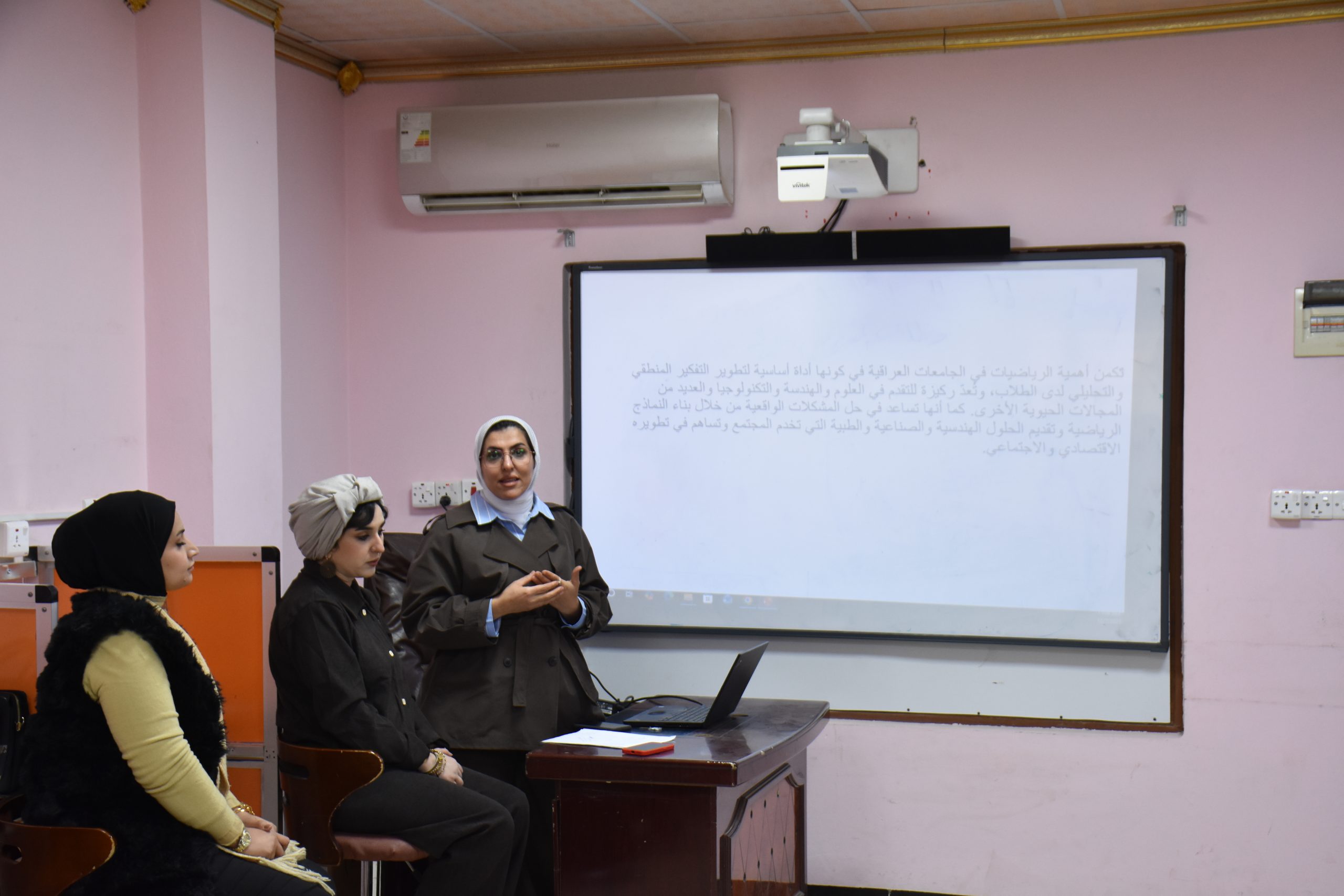 برعاية السيد رئيس الجامعة الاستاذ الدكتور تحسين حسين مبارك المحترم وبأشراف السيد عميد كليه الادارة والاقتصاد الاستاذ المساعد الدكتور نزار معن عبد الكريم المحترم اقام قسم الادارة العامة بالتعاون مع شعبه التعليم المستمر دورة تدريبية بعنوان (اهمية الرياضيات في الجامعات) حاضر فيها المدرس المساعد ايناس حسن عبد