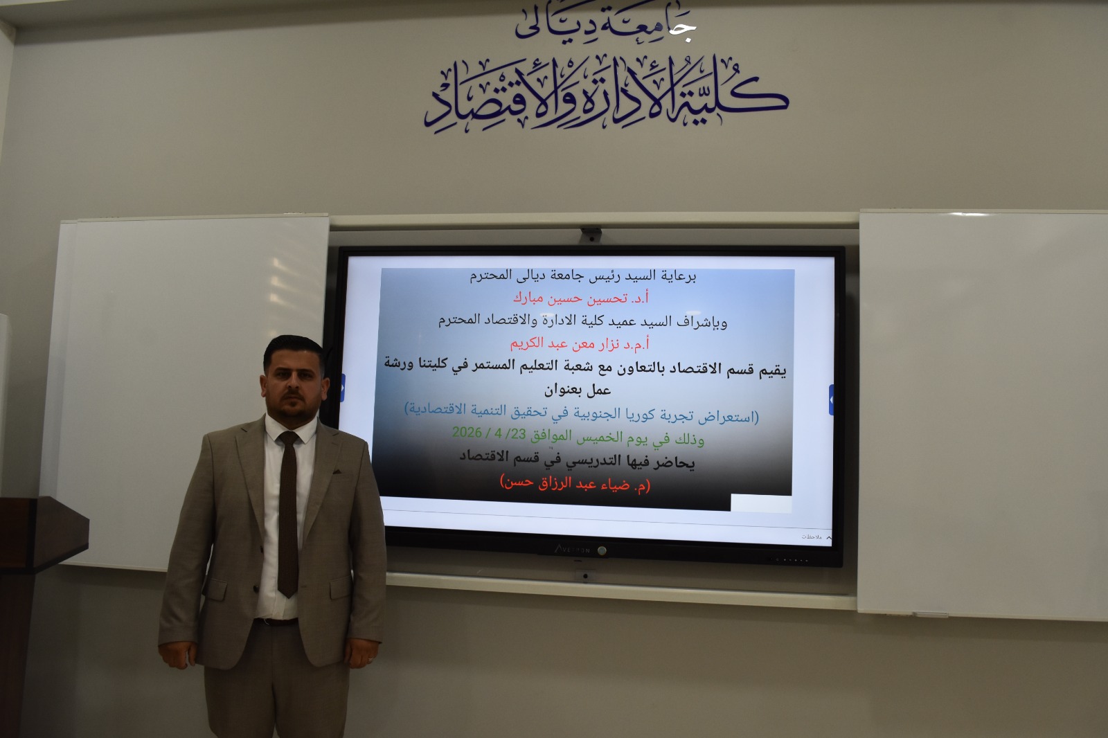 اقام قسم الاقتصاد بالتعاون مع شعبة التعليم المستمر ورشة عمل بعنوان (استعراض تجربة كوريا الجنوبية في تحقيق التنمية الاقتصادية) حاضر فيها المدرس ضياء عبد الرزاق حسن