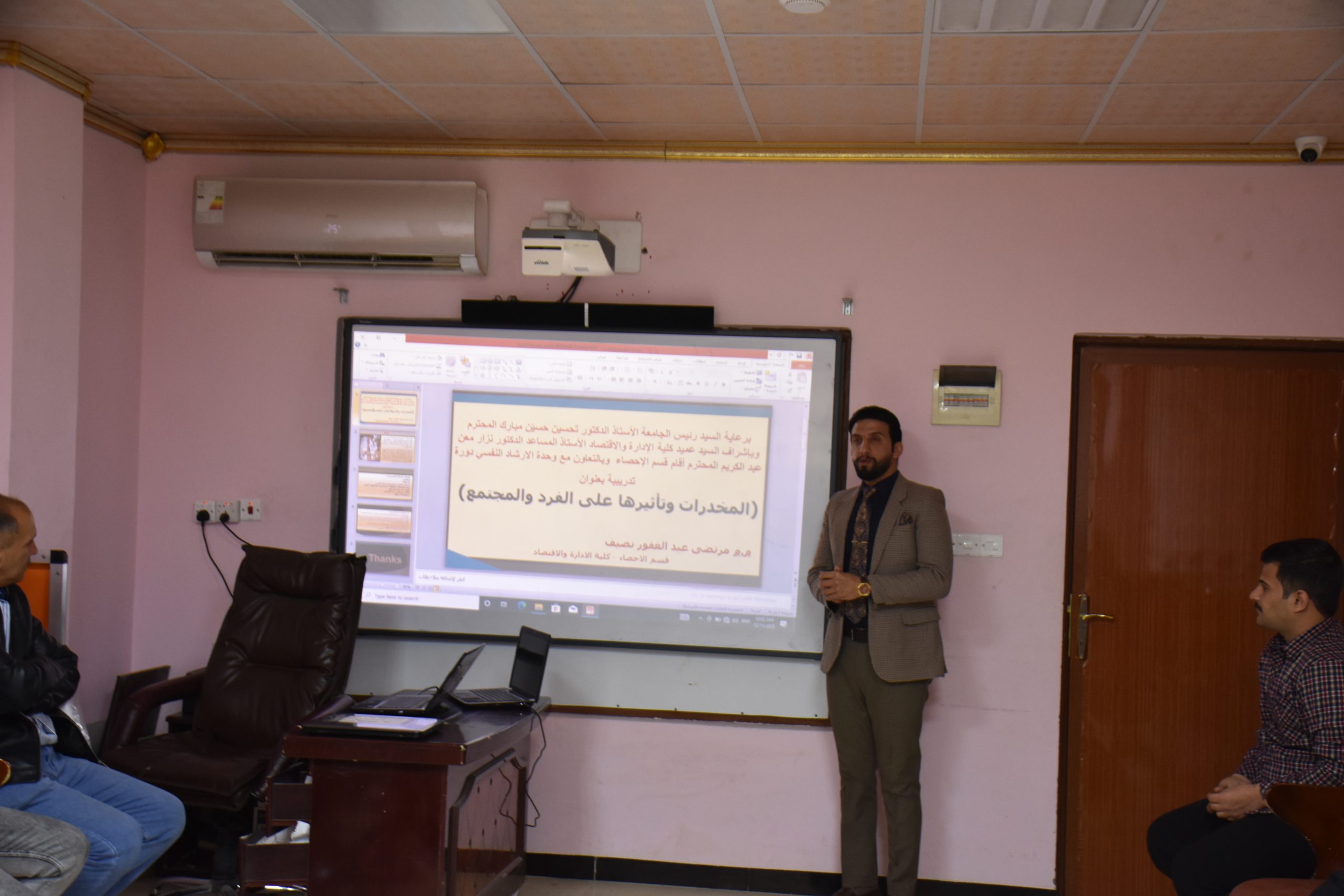 برعاية السيد رئيس الجامعة الأستاذ الدكتور تحسين حسين مبارك المحترم وبإشراف السيد عميد كلية الإدارة والاقتصاد الأستاذ المساعد الدكتور نزار معن عبد الكريم المحترم أقام قسم الإحصاء وبالتعاون مع وحدة الارشاد النفسي الجامعي دورة تدريبية بعنوان (المخدرات وتأثيرها على الفرد والمجتمع) حاضر فيها المدرس المساعد مرتضى عبد الغفور نصيف